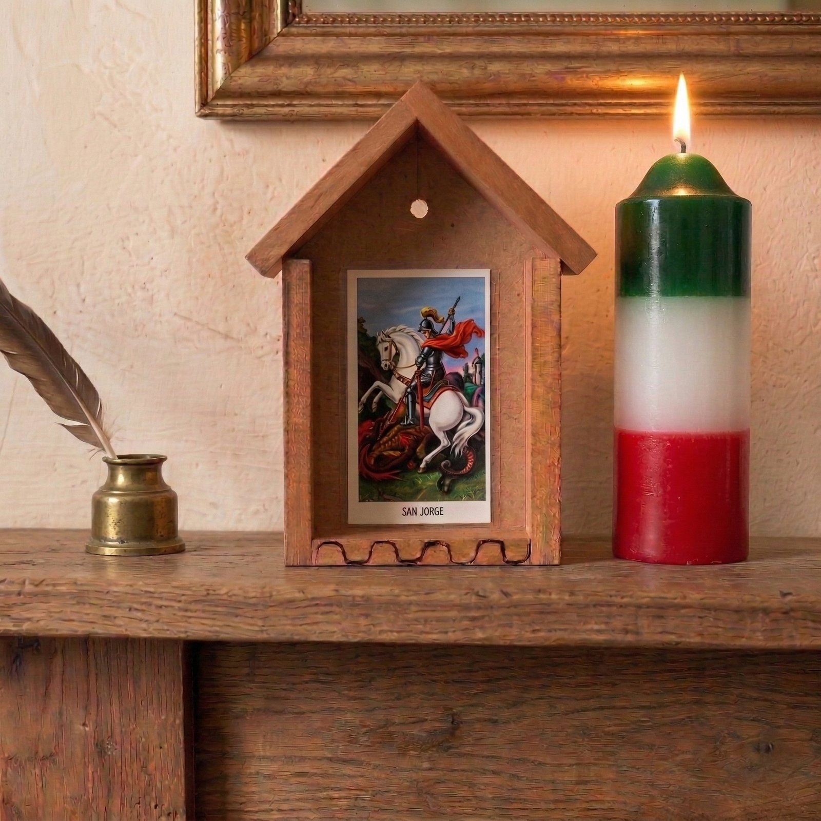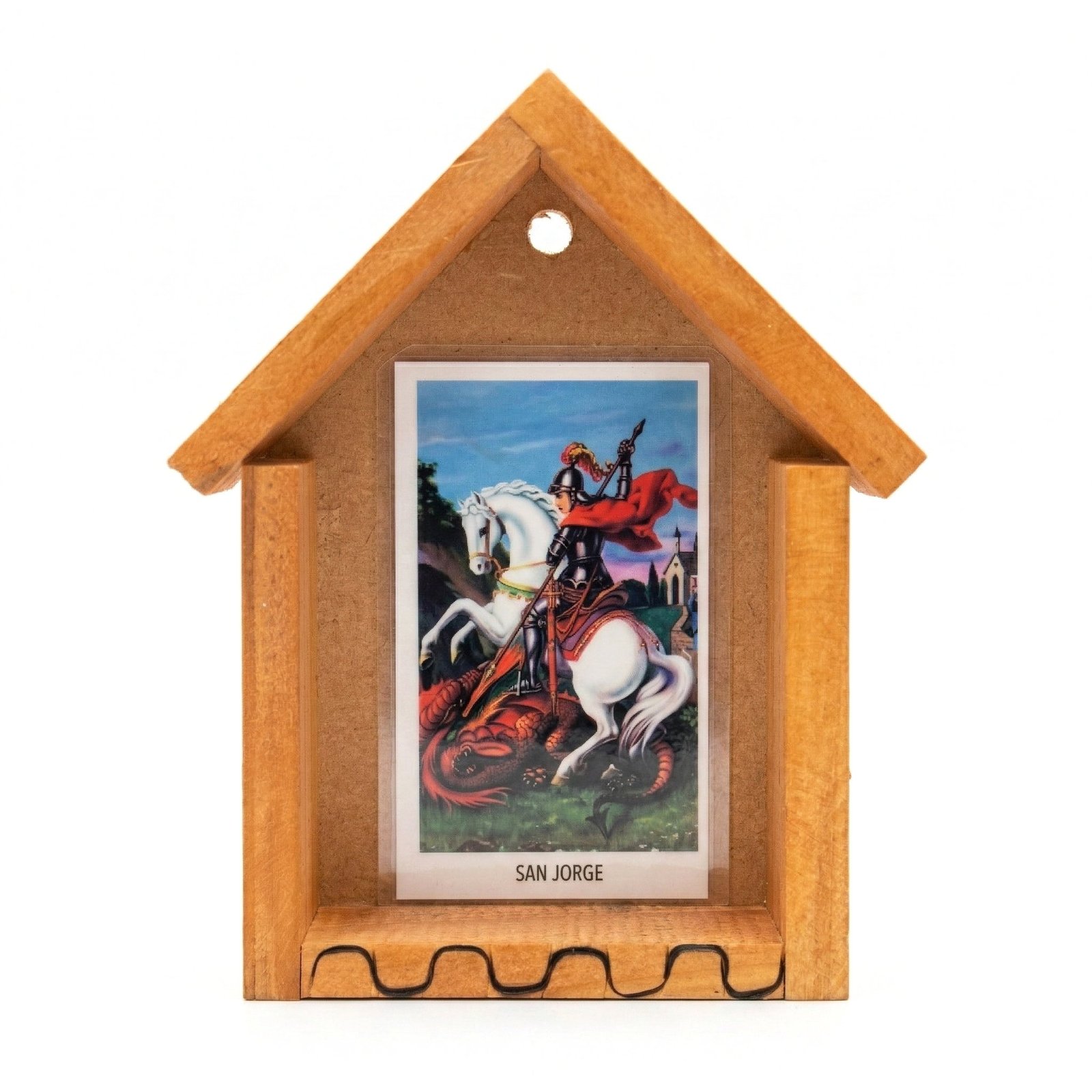 Orden visual: La estructura de la capilla «enmarca» la estampa, dándole un lugar de honor y respeto, evitando que sea simplemente un papel o cartón suelto.