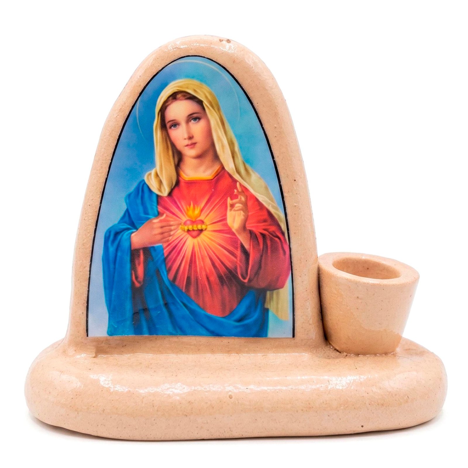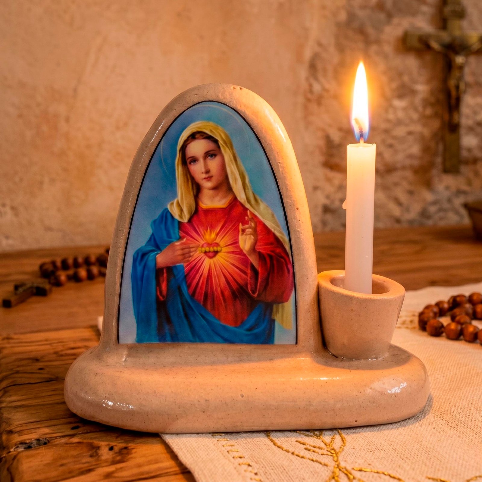 Crea un rincón de dulzura y devoción en tu hogar con este altar dedicado al Inmaculado Corazón de María. Diseñado para honrar su entrega y amor incondicional, incluye un soporte para vela que simboliza la llama encendida de la fe y la pureza de su alma. Un espacio sagrado para encontrar consuelo, meditar bajo su guía protectora y confiarle los secretos del corazón a nuestra Madre.