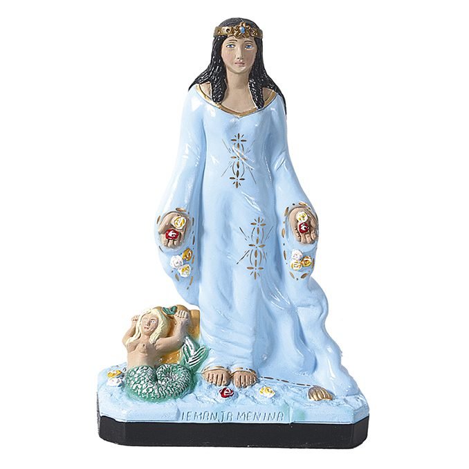 Iemanja niña en varias medidas hecha en yeso de exelente calidad para su mayor durabilidad, pintada a mano para lograr una gran candidad de detalles y mayor prefeccion en el rostro.